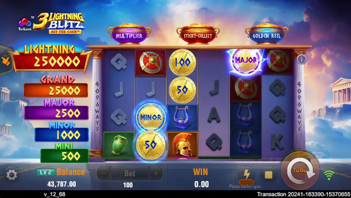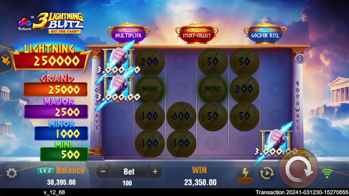 3 Lightning Blitz is a bonus-collecting slot game themed around Zeus, featuring a 4x6 reel layout with 4096 ways to win.